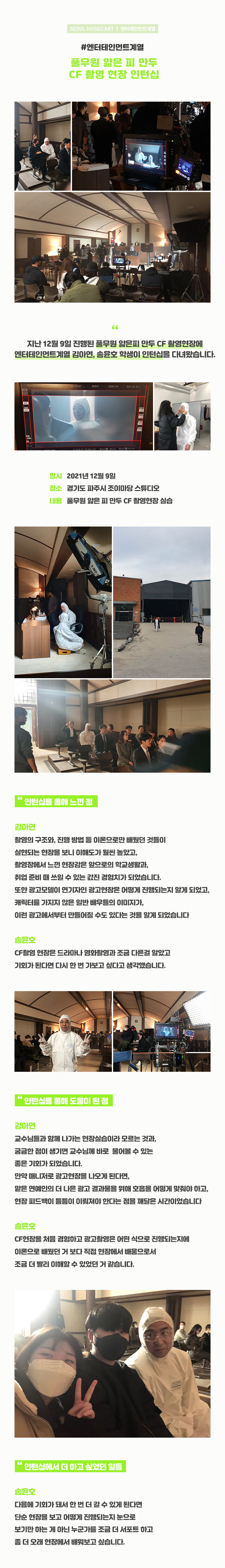 서울호서예술실용전문학교 엔터테인먼트계열 풀무원 얇은 피 만두 CF 촬영 현장 인턴십 지난 12월 9일 진행된 풀무원 얇은피 만두 CF 촬영현장에 엔터테인먼트계열 김아연, 송윤호 학생이 인턴십을 다녀왔습니다.