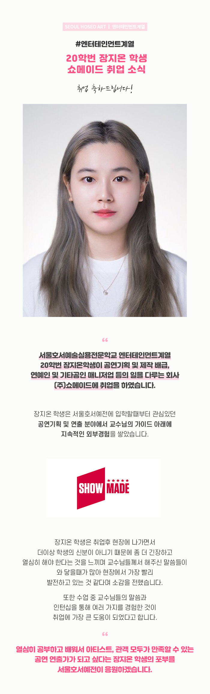 엔터테인먼트계열 20학번 장지온 학생 쇼메이드 취업 소식