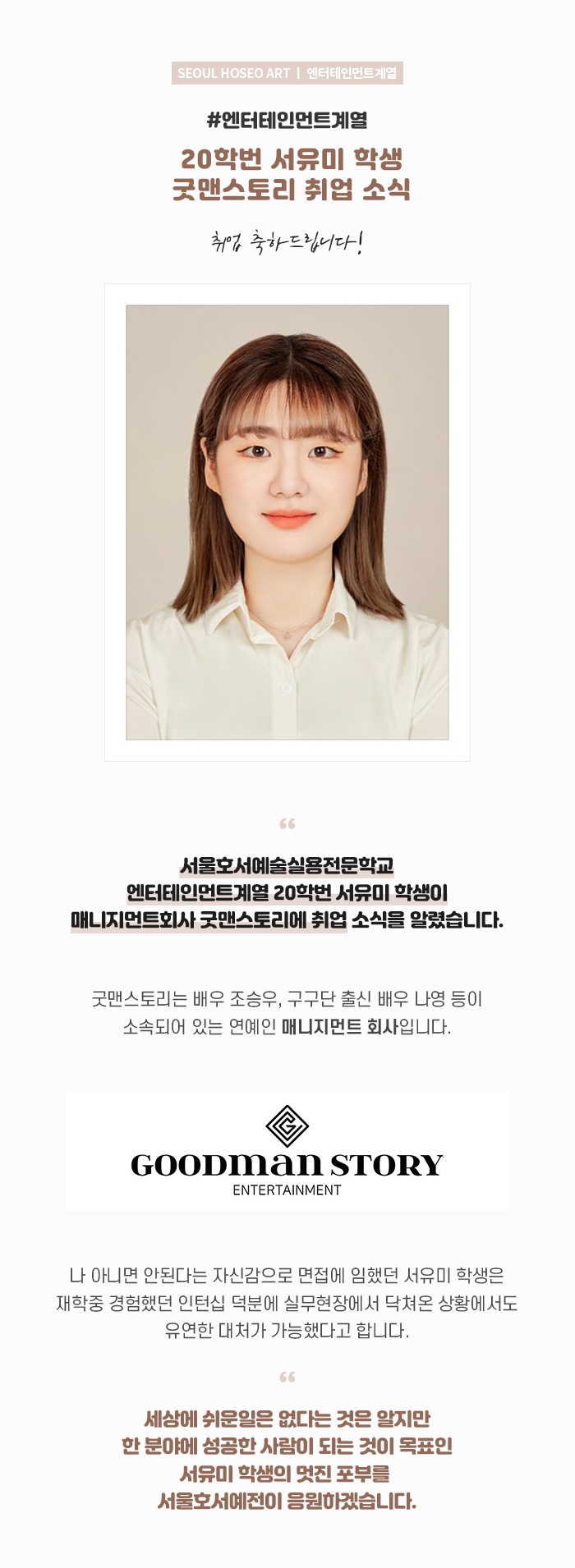 서울호서예술실용전문학교 엔터테인먼트계열 20학번 서유미 학생이 매니지먼트회사 굿맨스토리에 취업 소식을 알렸습니다. 굿맨스토리는 배우, 연예인 매니지먼트 회사입니다.