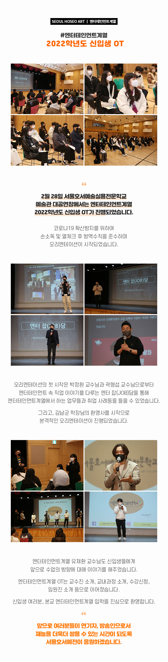 2월 28일 서울호서예술실용전문학교 예술관 대공연장에서는 엔터테인먼트계열 2022학년도 신입생 OT가 진행되었습니다. 코로나19 확산방지를 위하여 손소독 및 열체크 후 방역수칙을 준수하며 오리엔테이션이 시작되었습니다. 오리엔테이션의 첫 시작은 박정환 교수님과 곽형섭 교수님으로부터 엔터테인먼트 속 직업 이야기를 다루는 엔터 잡(JOB)담을 통해 엔터테인먼트계열에서 하는 업무들과 취업 사례등을 들을 수 있었습니다. 그리고, 김남균 학장님의 환영사를 시작으로 본격적인 오리엔테이션이 진행되었습니다. 엔터테인먼트계열 유재환 교수님도 신입생들에게 앞으로 수업의 방향에 대해 이야기를 해주었습니다.