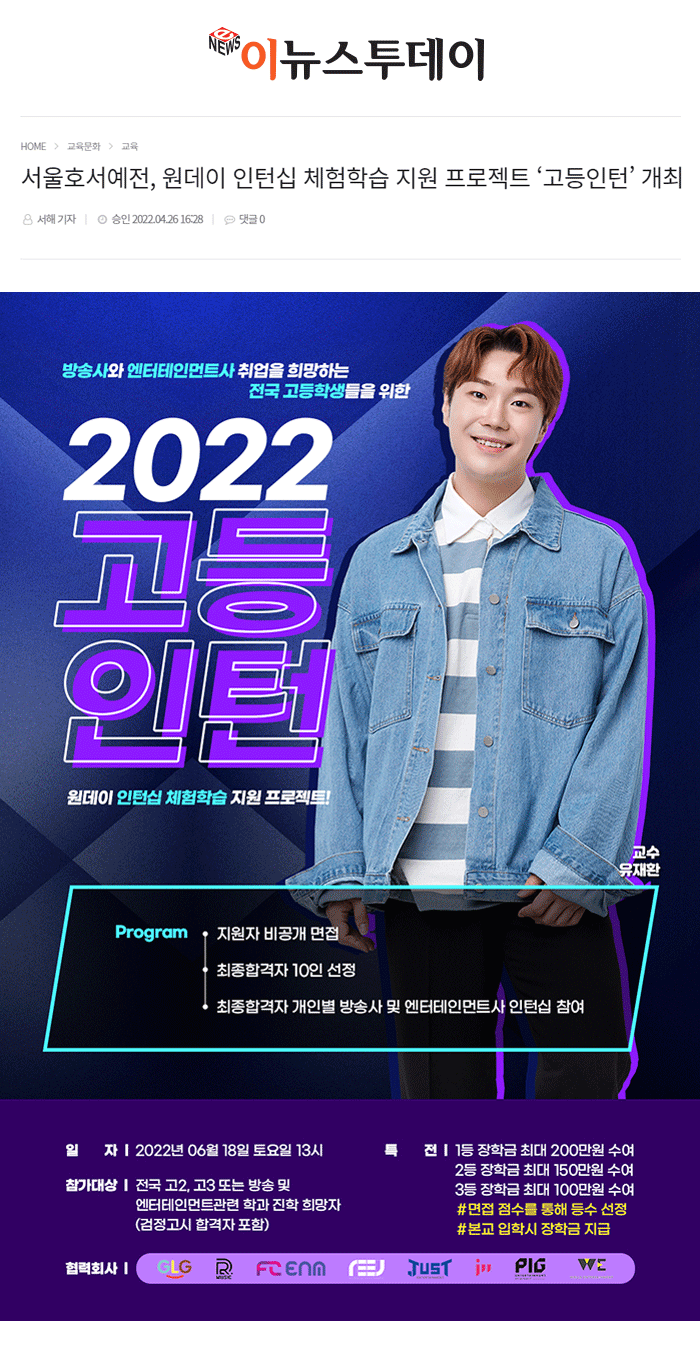 서울호서예술실용전문학교(이하 서울호서예전)에서 방송사와 엔터테인먼트사 취업을 희망하는 전국 고등학생들을 위해 원데이 인턴십 체험학습 지원 프로젝트인 ‘2022 고등인턴’을 개최한다고 밝혔다.