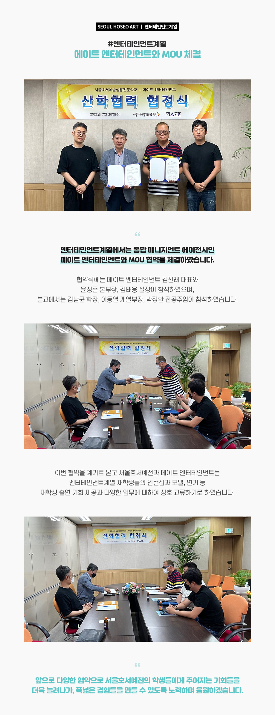 엔터테인먼트계열에서는 종합 매니지먼트 에이전시인 메이트 엔터테인먼트와 MOU 협약을 체결하였습니다. 협약식에는 메이트 엔터테인먼트 김진래 대표와 윤성준 본부장, 김태응 실장이 참석하였으며, 본교에서는 김남균 학장, 이동열 계열부장, 박정환 전공주임이 참석하였습니다.