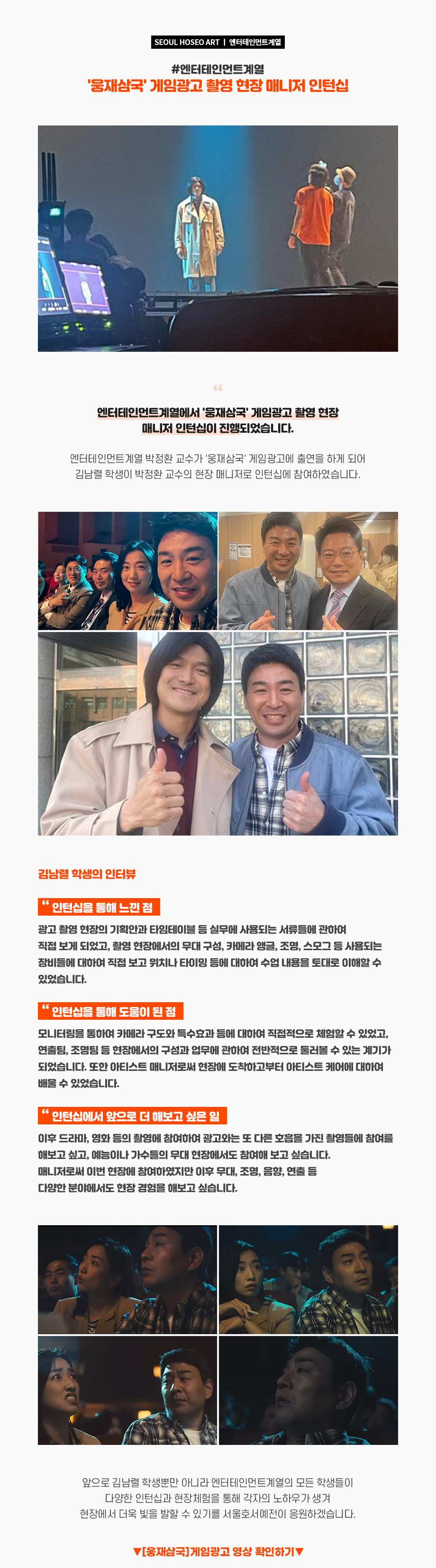 서울호서예술실용전문학교 엔터테인먼트계열에서 '웅재삼국' 게임광고 촬영 현장 매니저 인턴십이 진행되었습니다. 엔터테인먼트계열 박정환 교수가 '웅재삼국' 게임광고에 출연을 하게 되어 김남렬 학생이 박정환 교수의 현장 매니저로 인턴십에 참여하였습니다.