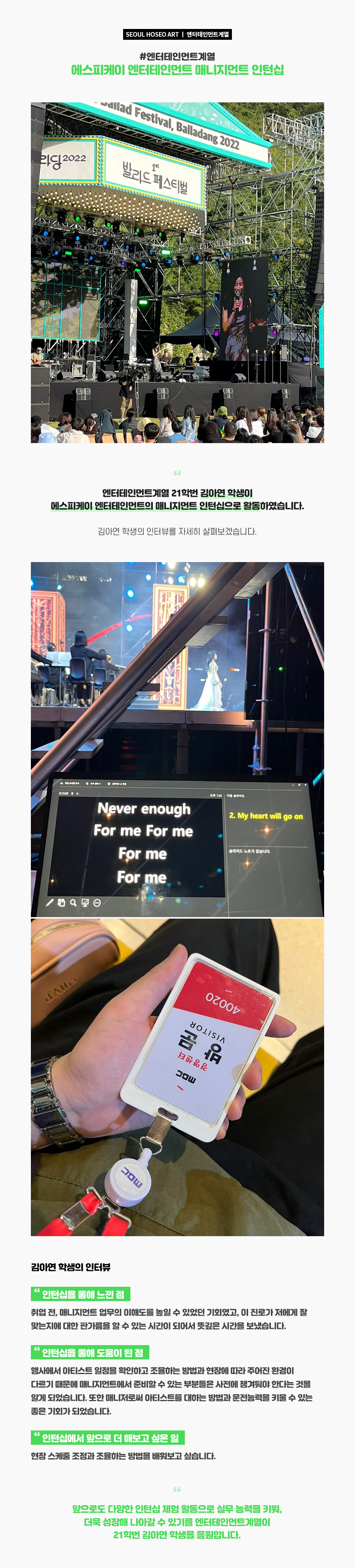엔터테인먼트계열 21학번 김아연 학생이 에스피케이 엔터테인먼트의 매니지먼트 인턴십으로 활동하였습니다. 김아연 학생의 자세한 인터뷰 내용을 살펴보겠습니다.