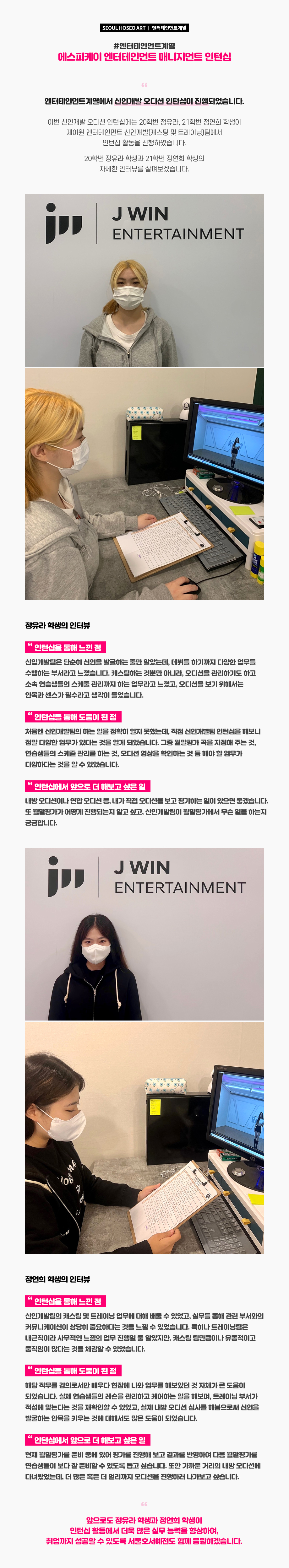 엔터테인먼트계열에서 신인개발 오디션 인턴십이 진행되었습니다. 이번 신인개발 오디션 인턴십에는 20학번 정유라, 21학번 정연희 학생이 제이윈 엔터테인먼트 신인개발(캐스팅 및 트레이닝)팀에서 인턴십 활동을 진행하였습니다. 20학번 정유라 학생과 21학번 정연희 학생의 자세한 인터뷰를 살펴보겠습니다.