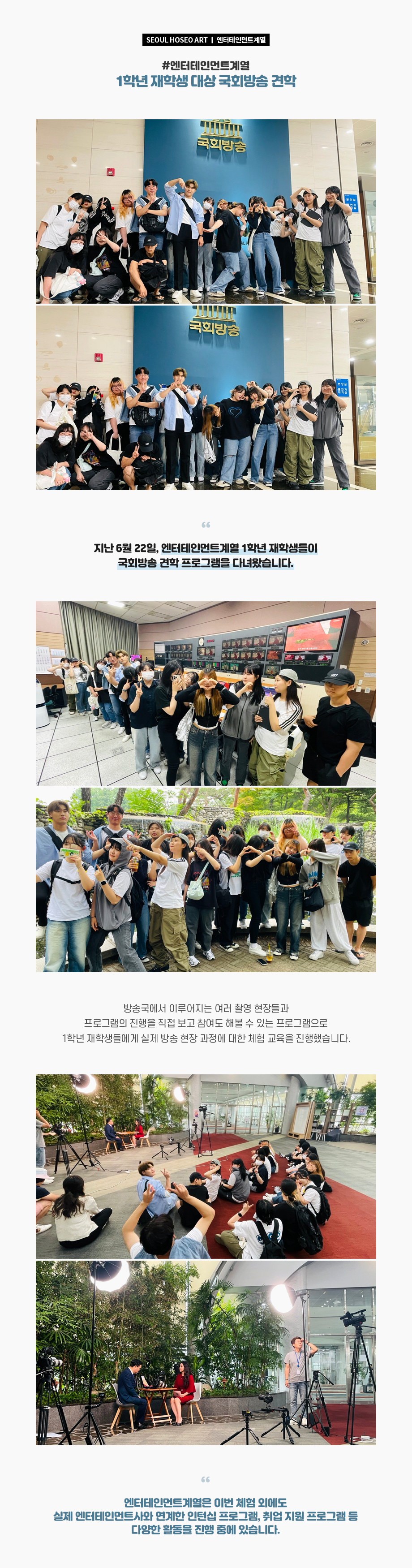 지난 6월 22일, 엔터테인먼트계열 1학년 재학생들이 국회방송 견학 프로그램을 다녀왔습니다. 방송국에서 이루어지는 여러 촬영 현장들과 프로그램의 진행을 직접 보고 참여도 해볼 수 있는 프로그램으로 1학년 재학생들에게 실제 방송 현장 과정에 대한 체험 교육을 진행했습니다.