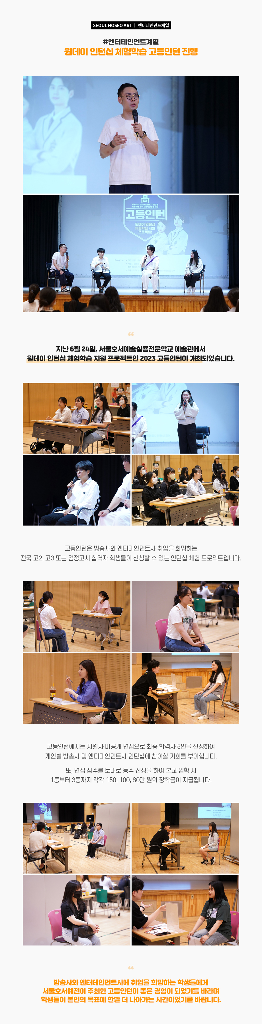 지난 6월 24일, 서울호서예술실용전문학교 예술관에서 원데이 인턴십 체험학습 지원 프로젝트인 2023 고등인턴이 개최되었습니다. 고등인턴은 방송사와 엔터테인먼트사 취업을 희망하는 전국 고2, 고3 또는 검정고시 합격자 학생들이 신청할 수 있는 인턴십 체험 프로젝트입니다.
