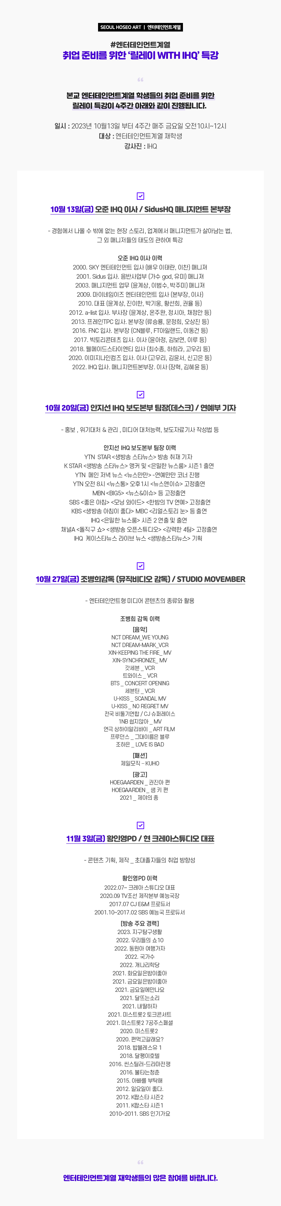 본교 엔터테인먼트계열 학생들의 취업 준비를 위한 릴레이 특강이 4주간 아래와 같이 진행됩니다.