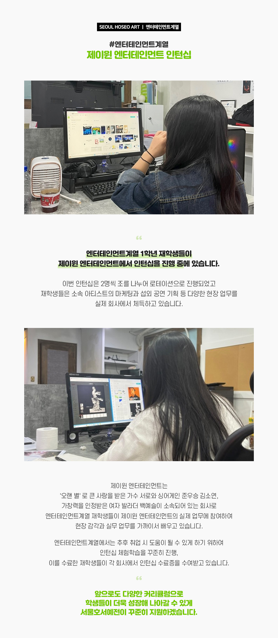 엔터테인먼트계열 1학년 재학생들이 제이윈 엔터테인먼트에서 인턴십을 진행 중에 있습니다. 이번 인턴십은 2명씩 조를 나누어 로테이션으로 진행되었고 재학생들은 소속 아티스트의 마케팅과 섭외 공연 기획 등 다양한 현장 업무를 실제 회사에서 체득하고 있습니다. 제이윈 엔터테인먼트는 '오랜 별' 로 큰 사랑을 받은 가수 서로와 싱어게인 준우승 김소연, 가창력을 인정받은 여자 발라더 백예슬이 소속되어 있는 회사로 엔터테인먼트계열 재학생들이 제이윈 엔터테인먼트의 실제 업무에 참여하여 현장 감각과 실무 업무를 가까이서 배우고 있습니다.