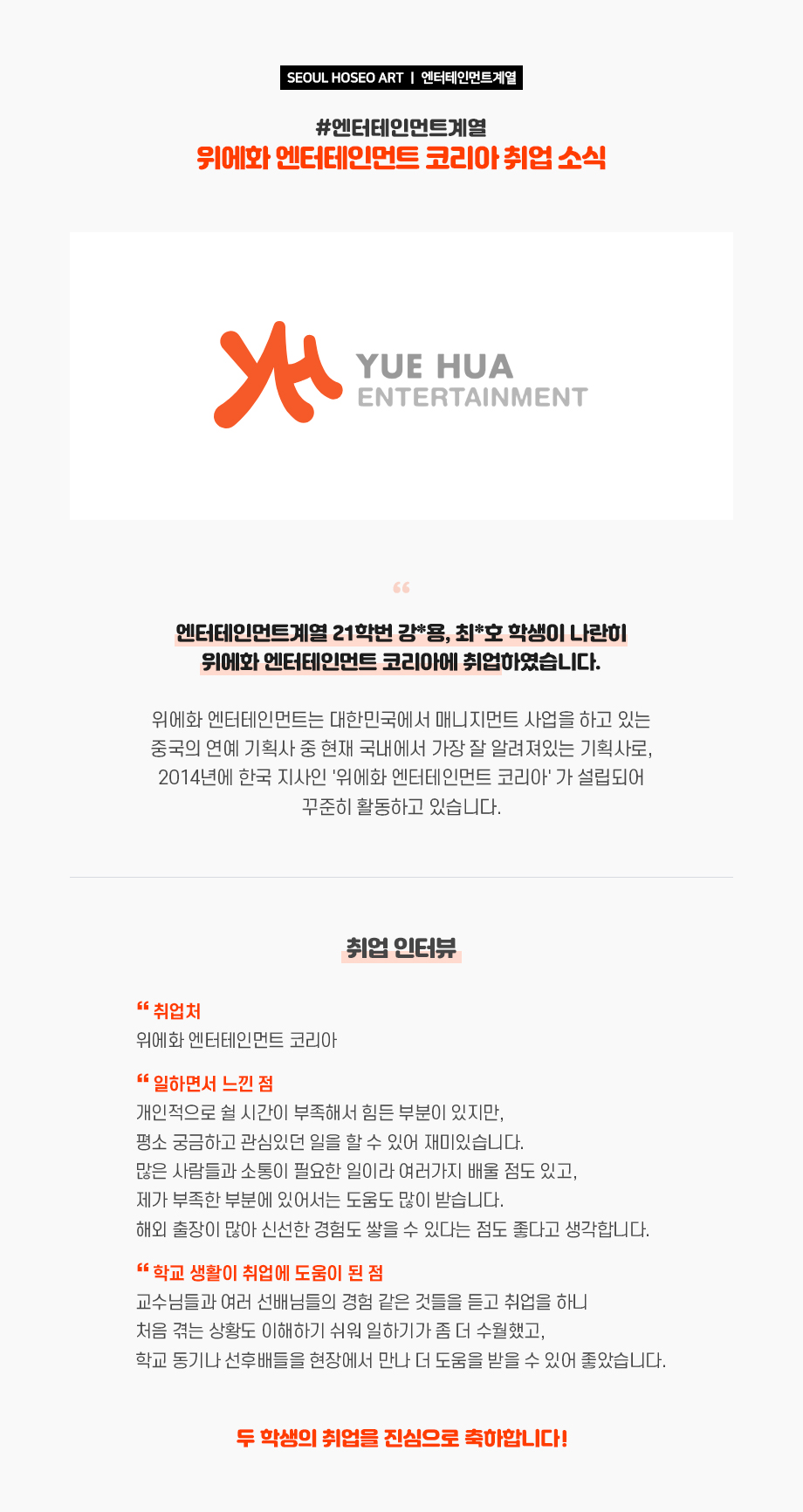엔터테인먼트계열 21학번 강*용, 최*호 학생이 나란히 위에화 엔터테인먼트 코리아에 취업하였습니다. 위에화 엔터테인먼트는 대한민국에서 매니지먼트 사업을 하고 있는 중국의 연예 기획사 중 현재 국내에서 가장 잘 알려져있는 기획사로, 2014년에 한국 지사인 '위에화 엔터테인먼트 코리아' 가 설립되어 꾸준히 활동하고 있습니다.