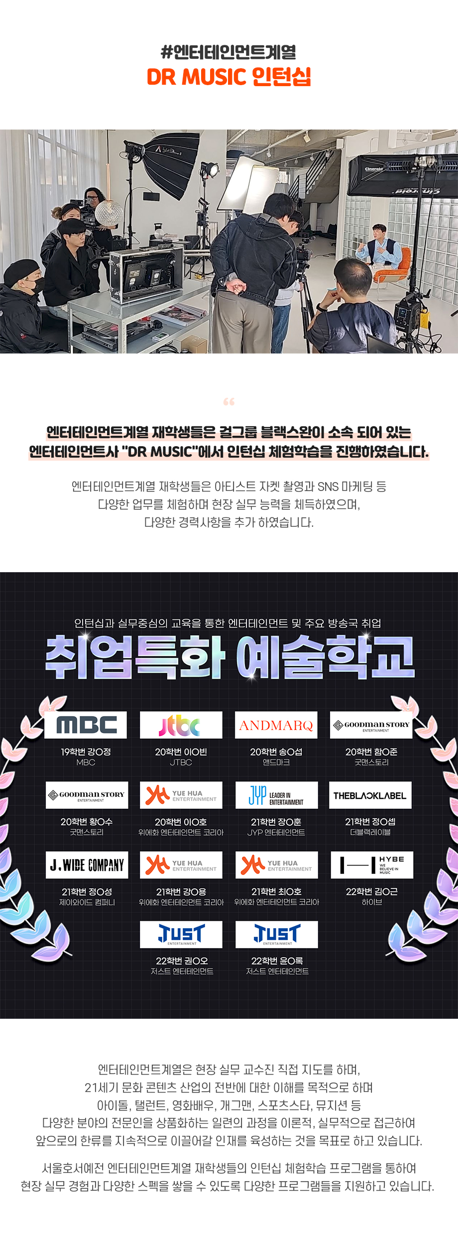엔터테인먼트계열 재학생들은 걸그룹 블랙스완이 소속 되어 있는 엔터테인먼트사 "DR MUSIC"에서 인턴십 체험학습을 진행하였습니다. 엔터테인먼트계열 재학생들은 아티스트 자켓 촬영과 SNS 마케팅 등 다양한 업무를 체험하며 현장 실무 능력을 체득하였으며 다양한 경력사항을 추가 하였습니다.
