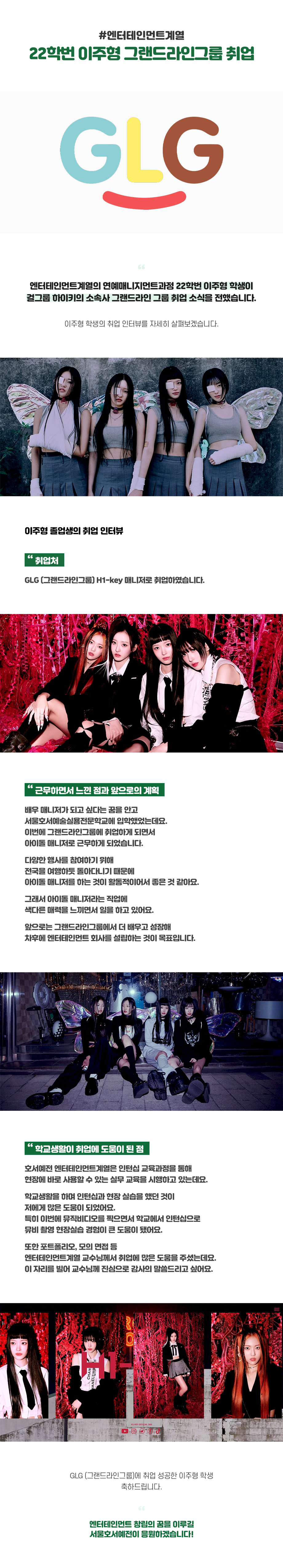 엔터테인먼트계열의 연예매니지먼트과정 22학번 이주형 학생이 걸그룹 하이키의 소속사 그랜드라인 그룹 취업 소식을 전했습니다. 이주형 학생의 취업 인터뷰를 자세히 살펴보겠습니다.