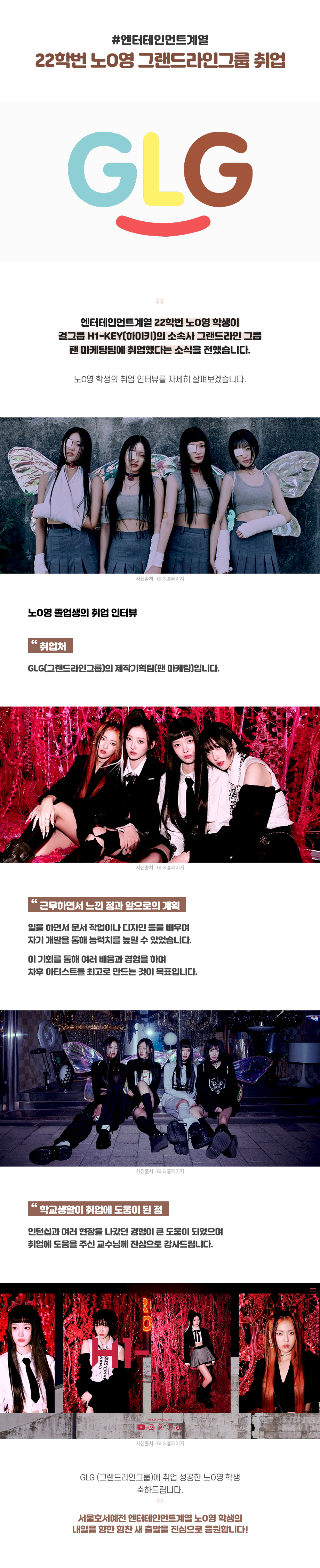엔터테인먼트계열 22학번 노*영 학생이 걸그룹 H1-KEY(하이키)의 소속사 'GLG(그랜드라인그룹)' 팬 마케팅팀에 취업 성공했다는 소식입니다. 다음은 노*영 학생의 인터뷰 내용입니다.