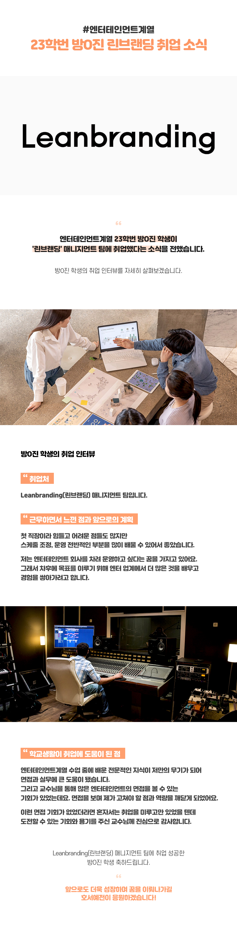 서울호서예술실용전문학교 엔터테인먼트계열 23학번 방O진 학생이 Leanbranding(린브랜딩) 매니지먼트 팀에 취업했다는 소식을 전했습니다. 방O진 학생의 취업 인터뷰를 자세히 살펴보겠습니다.