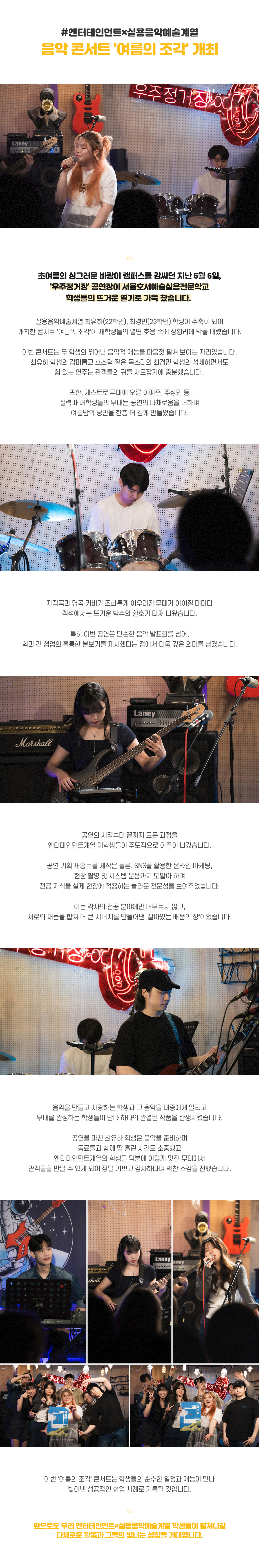 초여름의 싱그러운 바람이 캠퍼스를 감싸던 지난 6월 6일 금요일 오후 6시, '우주정거장' 공연장이 서울호서예술실용전문학교 학생들의 뜨거운 열기로 가득 찼습니다. 실용음악예술계열 최유하(22학번), 최경민(23학번) 학생이 주축이 되어 개최한 콘서트 '여름의 조각'이 재학생들의 열띤 호응 속에 성황리에 막을 내렸습니다.