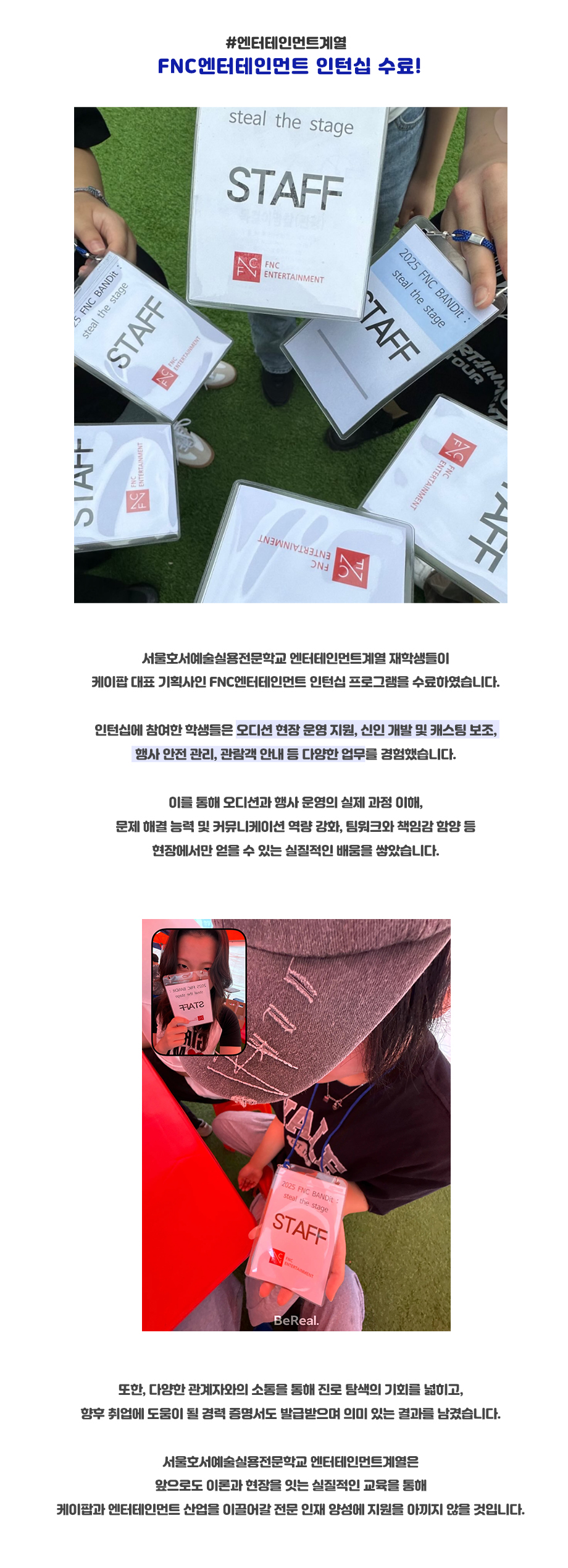 서울호서예술실용전문학교 엔터테인먼트계열 재학생들이 케이팝 대표 기획사인 FNC엔터테인먼트 인턴십 프로그램을 수료하였습니다.