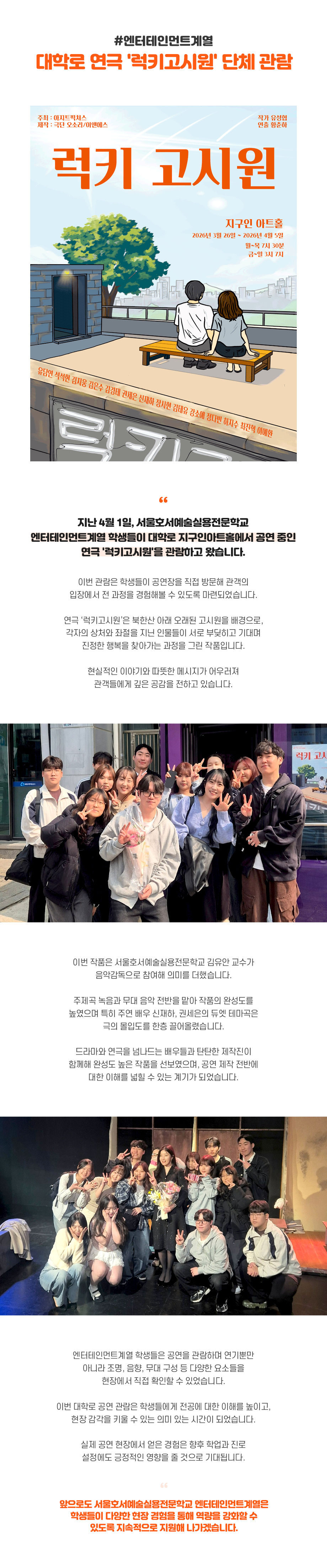 지난 4월 1일, 서울호서예술실용전문학교 엔터테인먼트계열 학생들이 대학로 지구인아트홀에서 공연 중인 연극 '럭키고시원'을 관람하고 왔습니다.