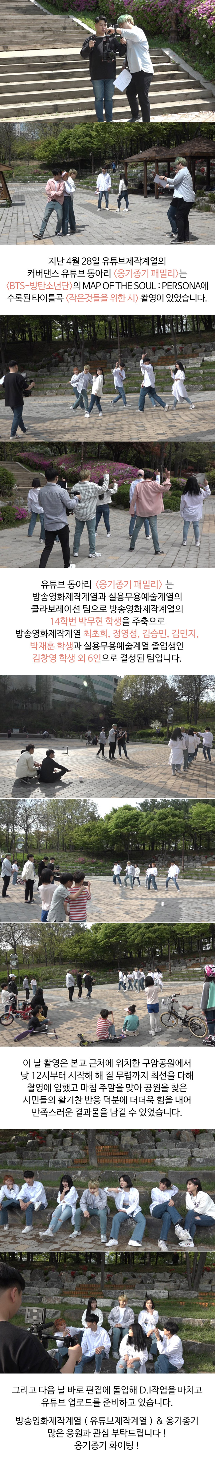 지난 4월 28일 유튜브제작계열의 커버댄스 유튜브 동아리 '옹기종기 패밀리' 는 BTS 방탄소년단의 MAP OF THE SOUL : PERSONA에 수록된 타이틀곡 '작은것들을 위한 시' 촬영이 있었습니다.