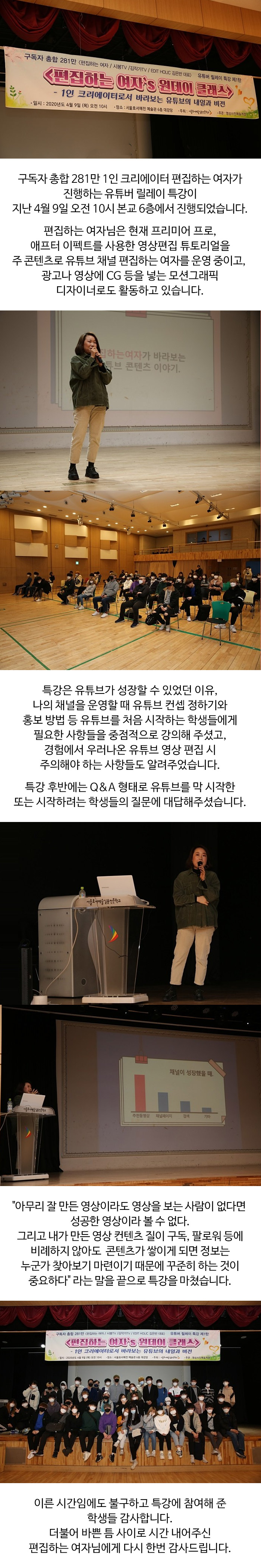 구독자 총합 281만 1인 크리에이터 편집하는 여자가 진행하는 유튜버 릴레이 특강이 지난 4월 9일 오전 10시 본교 6층에서 진행되었습니다.