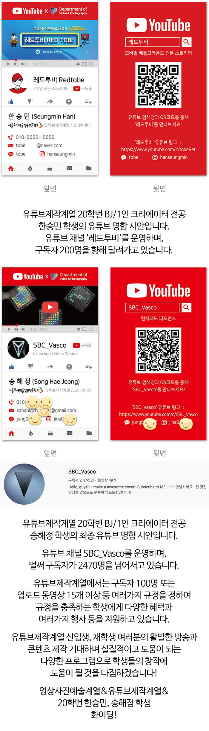 유튜브제작계열 20학번 BJ/1인 크리에이터 전공 한승민 학생과 송해정 학생의 유튜브 명함을 공개합니다.
