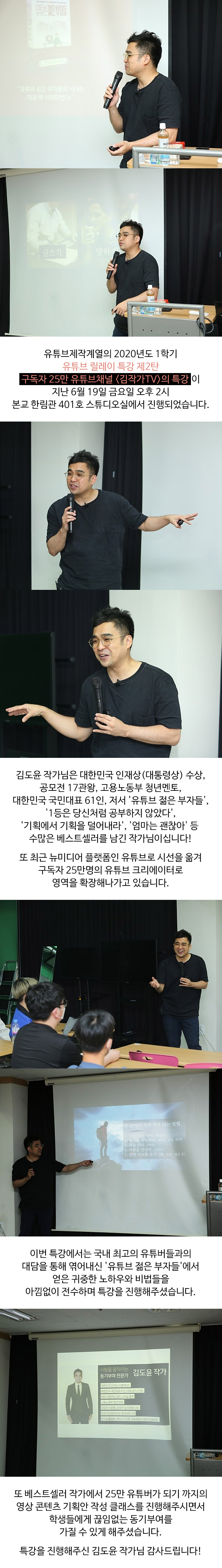 유튜브제작계열의 2020년도 1학기 유튜브 릴레이 특강 제2탄 구독자 25만 유튜브채널 '김작가TV'의 특강이 지난 6월 19일 금요일 오후 2시 서울호서예전 한림관 401호 스튜디오실에서 진행되었습니다.