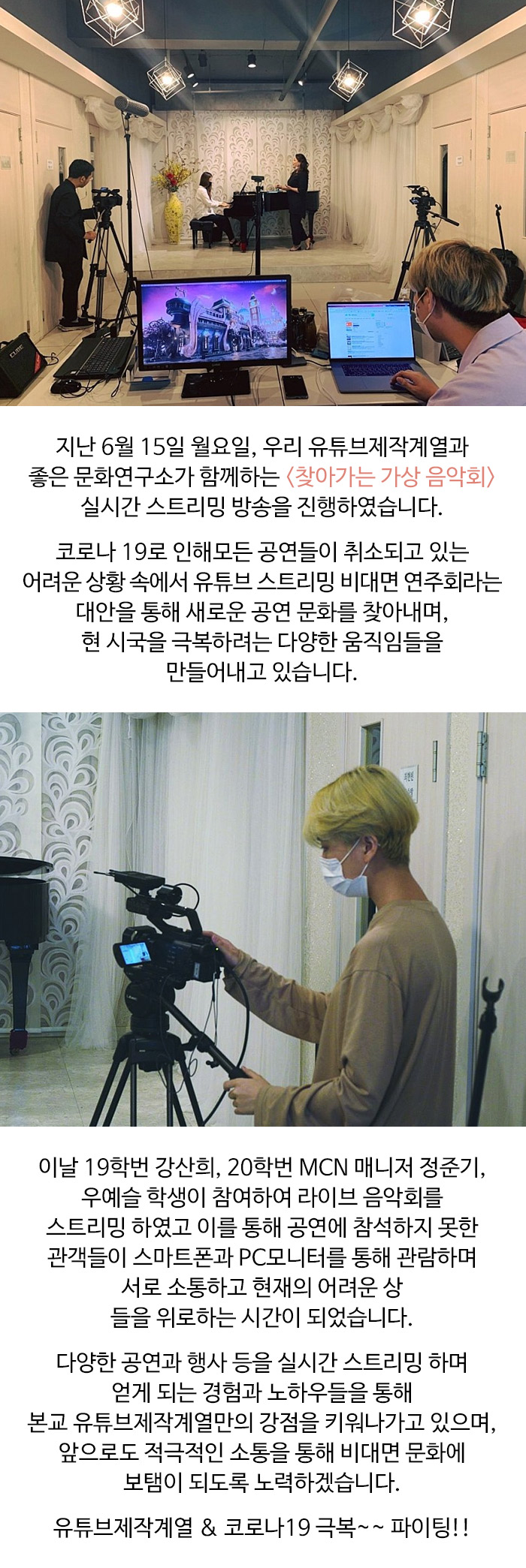 지난 6월 15일 월요일, 우리 유튜브제작계열과 좋은 문화연구소가 함께하는 '찾아가는 가상 음악회' 실시간 스트리밍 방송을 진행하였습니다.