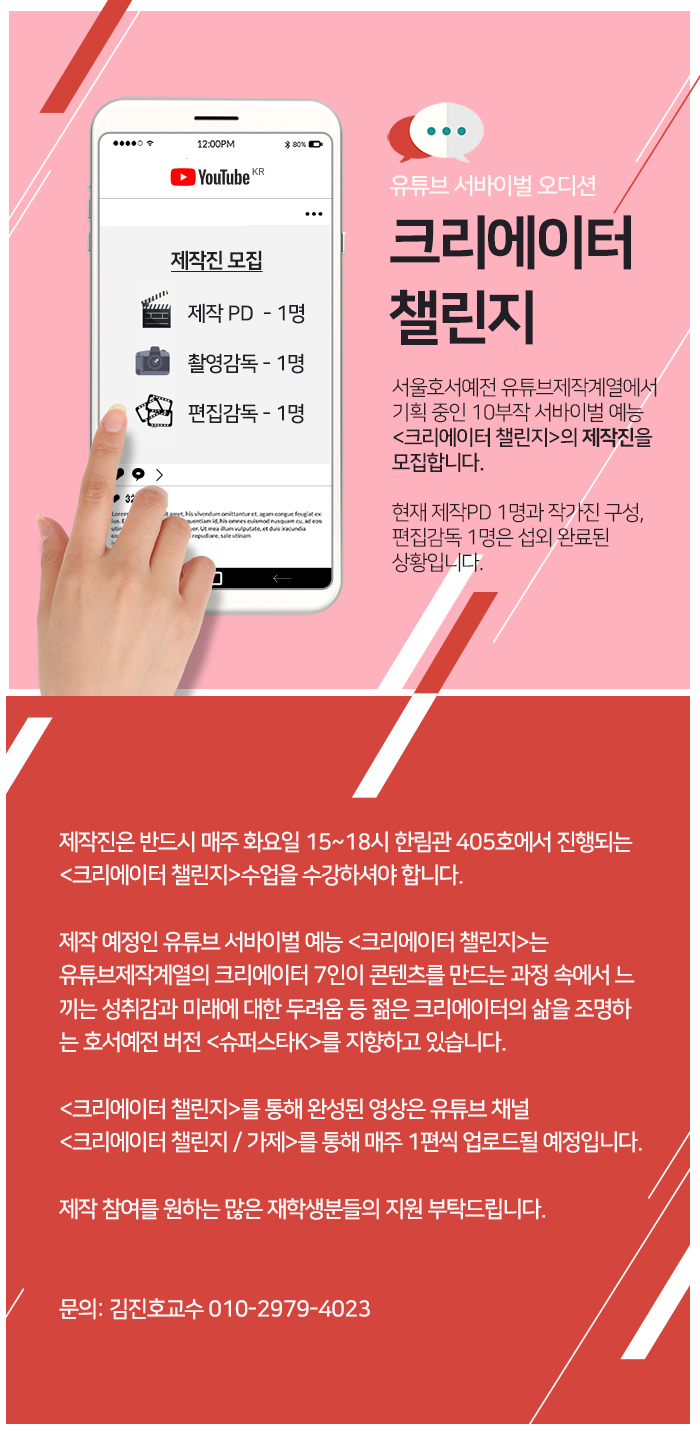 유튜브제작계열에서 기획 중인 10부작 유튜버 서바이벌 예능 <크리에이터 챌린지>의 제작진을 모집합니다.