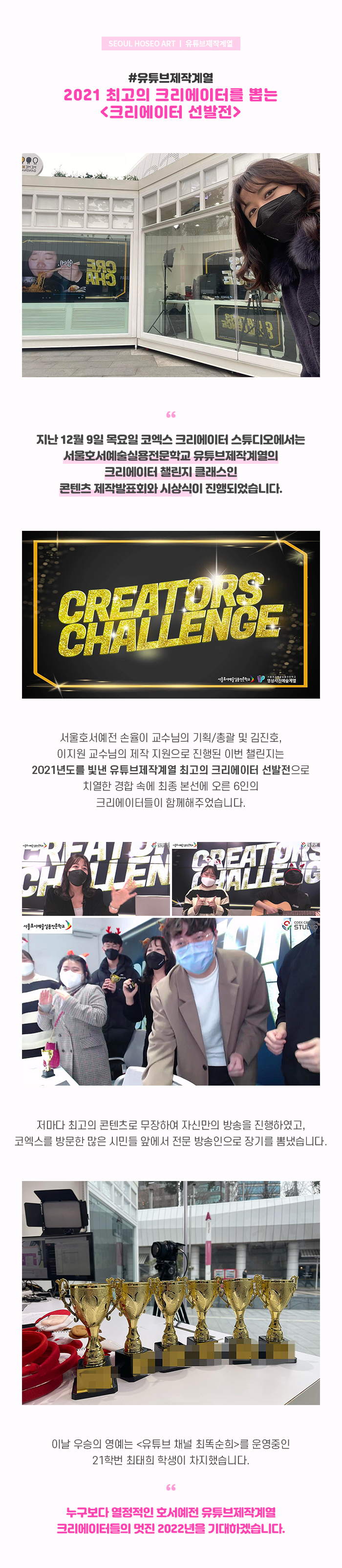 서울호서예술실용전문학교 유튜브제작계열 2021 최고의 크리에이터를 뽑는 <크리에이터 선발전> 지난 12월 9일 목요일 코엑스 크리에이터 스튜디오에서는 서울호서예술실용전문학교 유튜브제작계열의 크리에이터 챌린지 클래스인 콘텐츠 제작발표회와 시상식이 진행되었습니다.