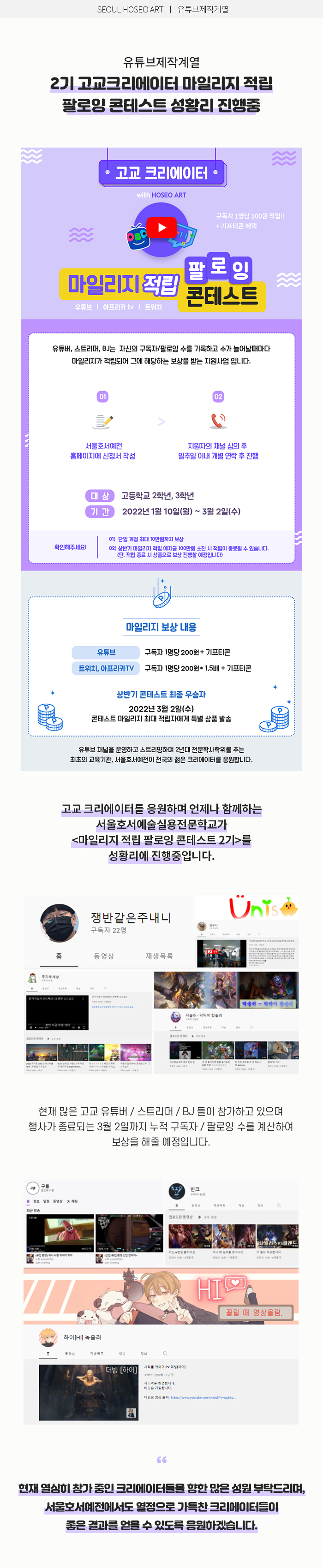 고교 크리에이터를 응원하며 언제나 함께하는 서울호서예술실용전문학교가 <마일리지 적립 팔로잉 콘테스트 2기>를 성황리에 진행중입니다. 현재 많은 고교 유튜버 / 스트리머 / BJ 들이 참가하고 있으며 행사가 종료되는 3월 2일까지 누적 구독자 / 팔로잉 수를 계산하여 보상을 해줄 예정입니다.