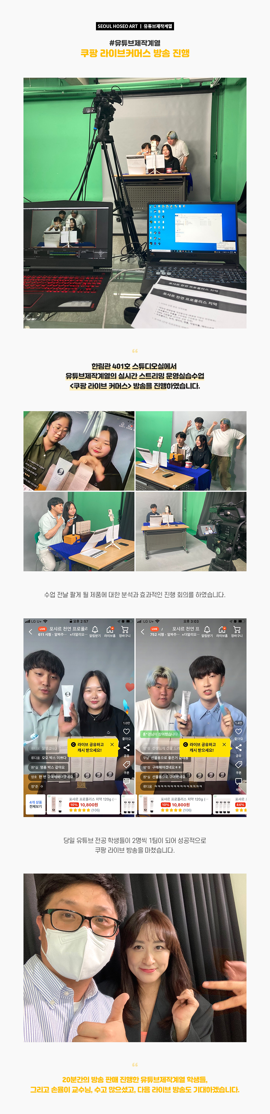 한림관 401호 스튜디오실에서 유튜브제작계열의 실시간 스트리밍 운영실습수업 <쿠팡 라이브 커머스> 방송을 진행하였습니다. 수업 전날 팔게 될 제품에 대한 분석과 효과적인 진행 회의를 하였습니다.