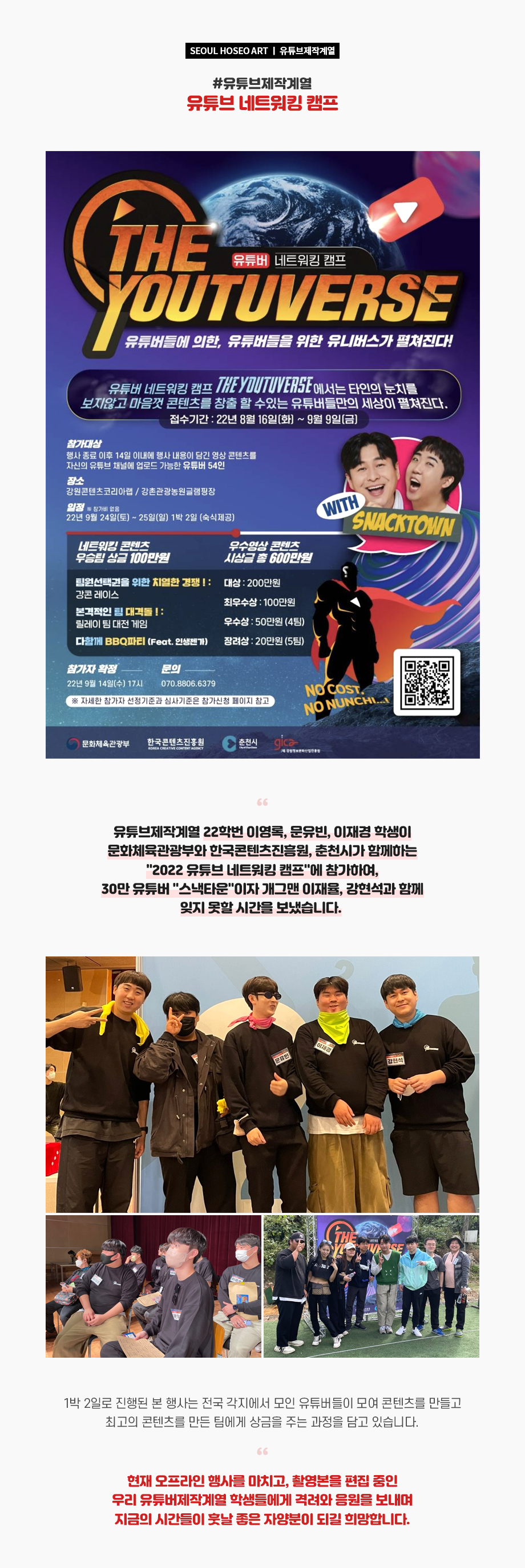 유튜브제작계열 22학번 이영록, 문유빈, 이재경 학생이 문화체육관광부와 한국콘텐츠진흥원, 춘천시가 함께하는 "2022 유튜브 네트워킹 캠프"에 참가하여, 30만 유튜버 "스낵타운"이자 개그맨 이재율, 강현석과 함께 잊지 못할 시간을 보냈습니다.