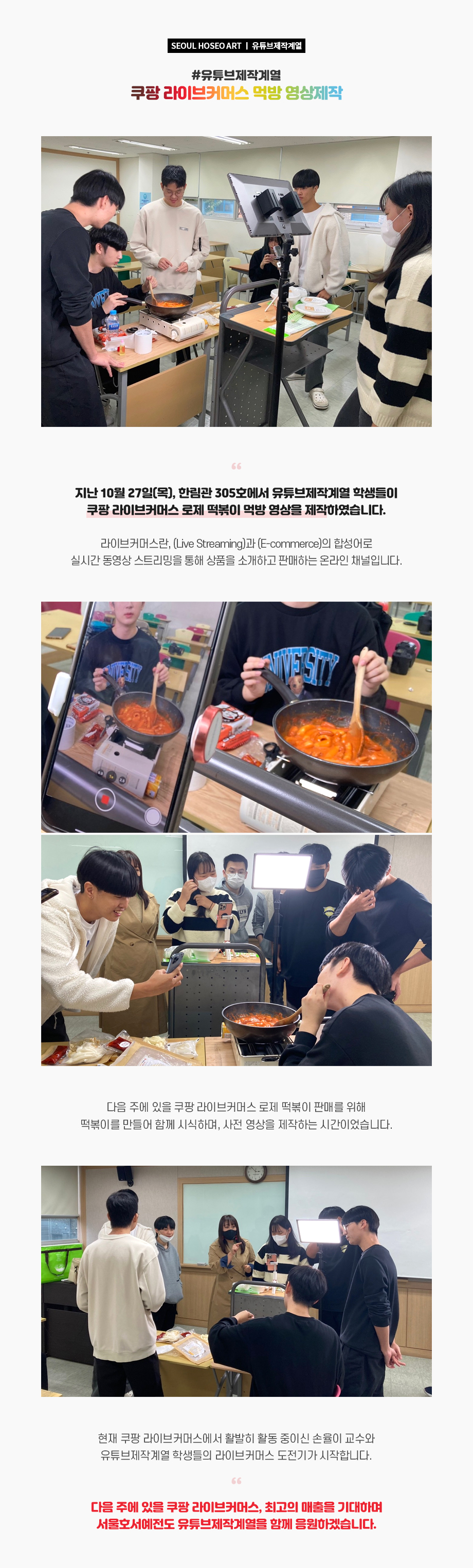 지난 10월 27일(목), 한림관 305호에서 유튜브제작계열 학생들이 쿠팡 라이브커머스 로제 떡볶이 먹방 영상을 제작하였습니다. 라이브커머스란, (Live Streaming)과 (E-commerce)의 합성어로 실시간 동영상 스트리밍을 통해 상품을 소개하고 판매하는 온라인 채널입니다.