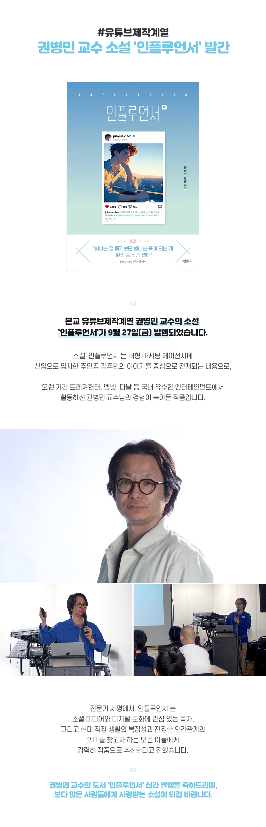 본교 유튜브제작계열 권병민 교수의 소설 '인플루언서'가 지난 9월 27일 발행되었습니다. 소설 '인플루언서'는 대형 마케팅 에이전시에 신입으로 입사한 주인공 김주현의 이야기를 중심으로 전개되는 내용으로, 오랜 기간 트레져헌터, 엠넷, 다날 등 국내 유수한 엔터테인먼트에서 활동하신 권병민 교수님의 경험이 녹아든 작품입니다.