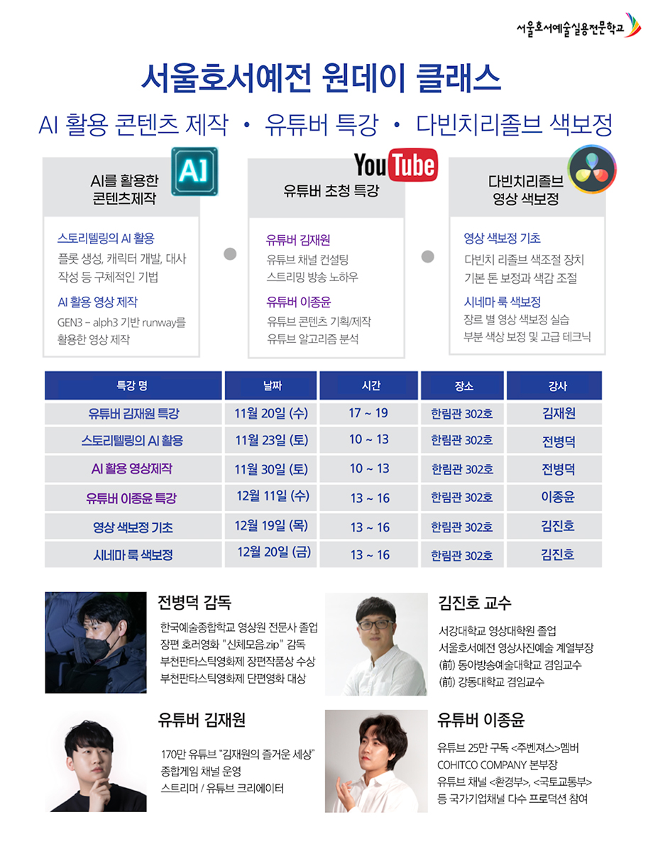 서울호서실용전문학교 방송영화제작계열X유튜브제작계열의 예비 신입생을 위한 원데이클래스를 진행합니다.