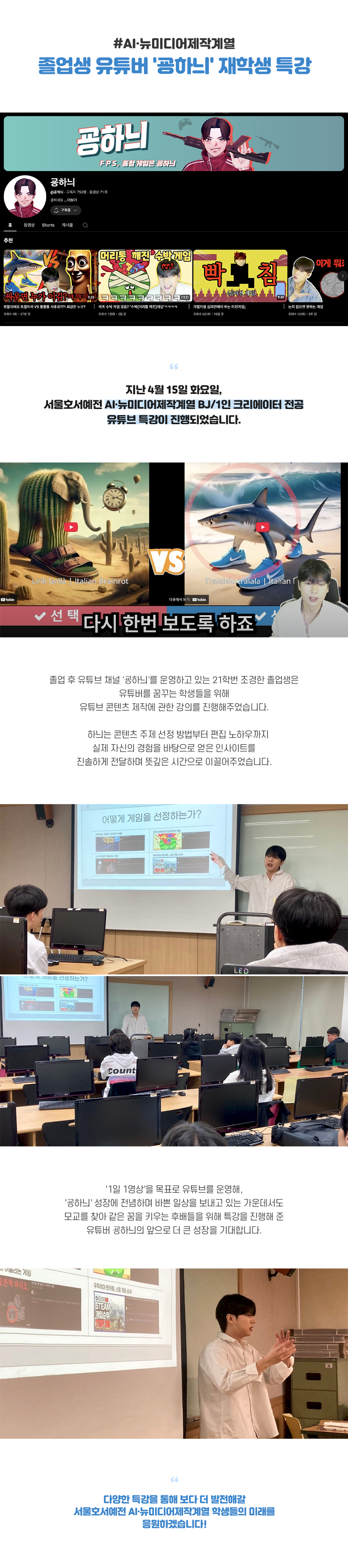 지난 4월 15일 화요일, 서울호서예전 AI·뉴미디어제작계열 BJ/1인 크리에이터 전공 유튜브 특강이 진행되었습니다. 졸업 후 유튜브 채널 '굥하늬'를 운영하고 있는 21학번 조경한 졸업생은 유튜버를 꿈꾸는 학생들을 위해 유튜브 콘텐츠 제작에 관한 강의를 진행해주었습니다.