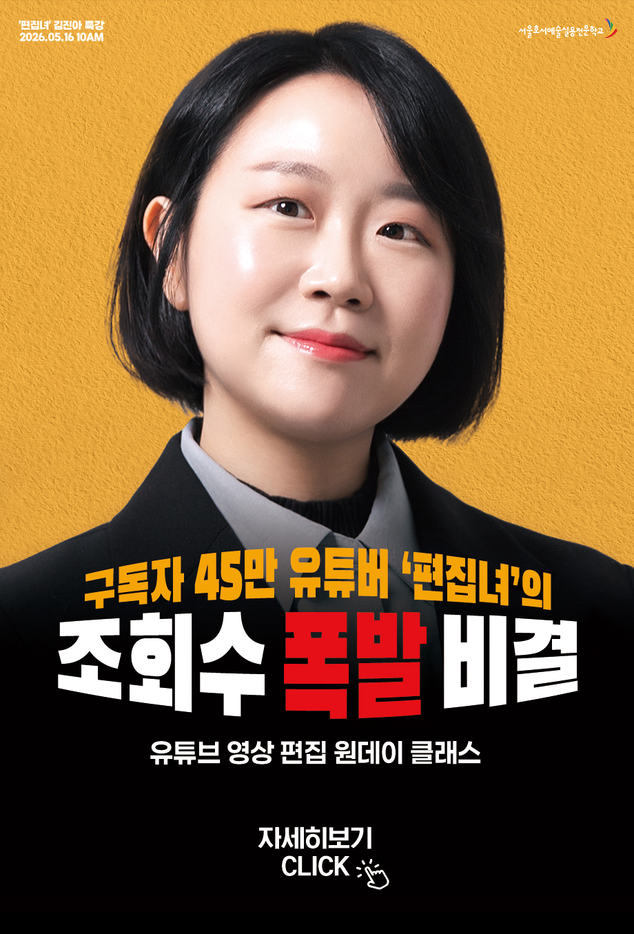서울호서예술실용전문학교 미디어커뮤니케이션계열 구독자 45만 유튜버 ‘편집녀’의 조회수 폭발 비결 유튜브 영상 편집 원데이 클래스 신청하기