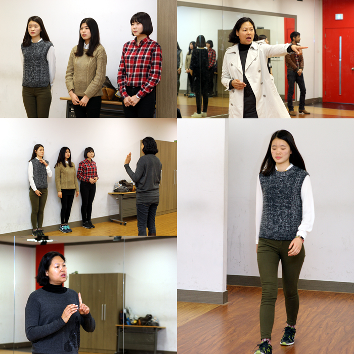이쁜 여학생들이 참여한 모델예술학부의 일일체험학교는 이복영 교수님께서 자세잡는 법, 워킹하는 법에 대해서 알려주셨습니다. 직접 학생들이 워킹을 해보고 고칠 점이 있는지 포즈는 어떻게 취해야 하는지에 대해서 배울 수 있었습니다.
