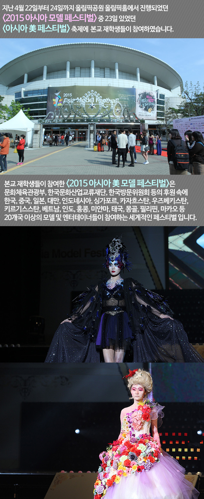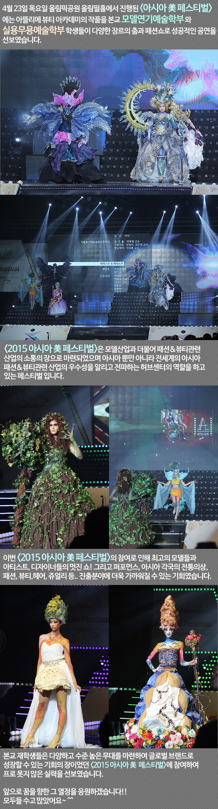 22일부터 24일까지 올림픽공원 올림픽홀에서 진행되었던 <2015 아시아 모델 페스티벌> 기간 중 본교 재학생들은 23일 있었던 <아시아 美 페스티벌>축제에 함께하여 멋진 워킹과 포즈를 선보였습니다.