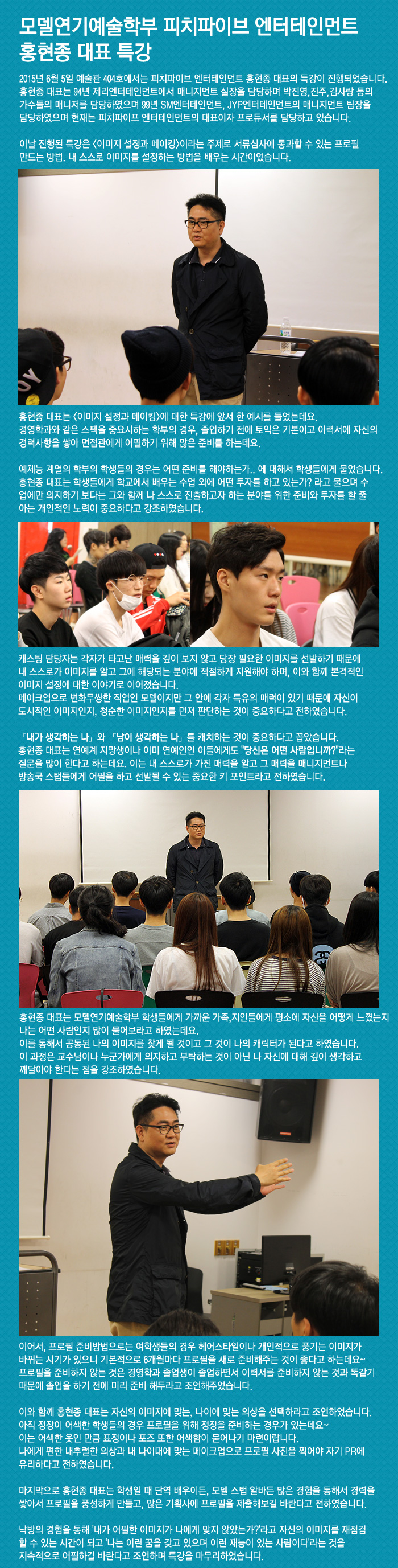 2015년 6월 5일 예술관 404호에서는 피치파이브 엔터테인먼트 홍현종 대표의 특강이 진행되었습니다.