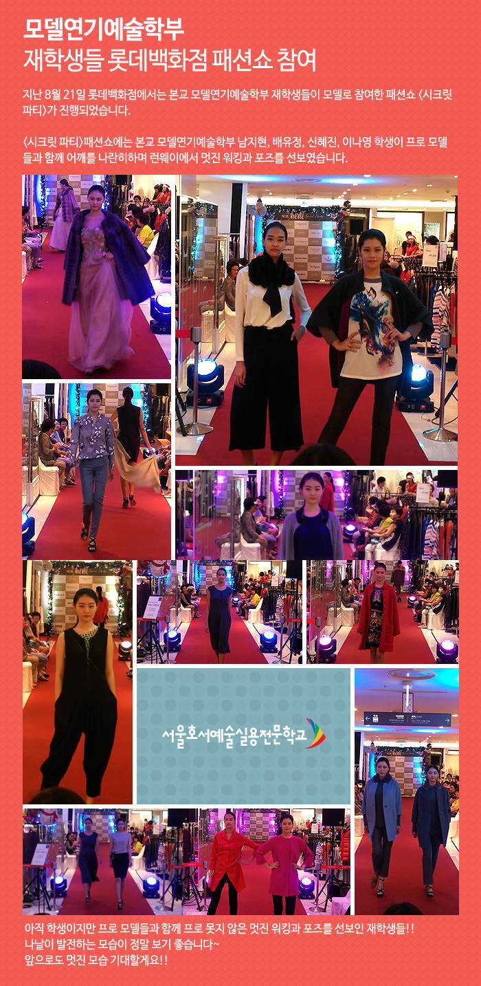 지난 8월 21일 롯데백화점에서는 본교 모델연기예술학부 재학생들이 모델로 참여한 패션쇼 <시크릿 파티>가 진행되었습니다.