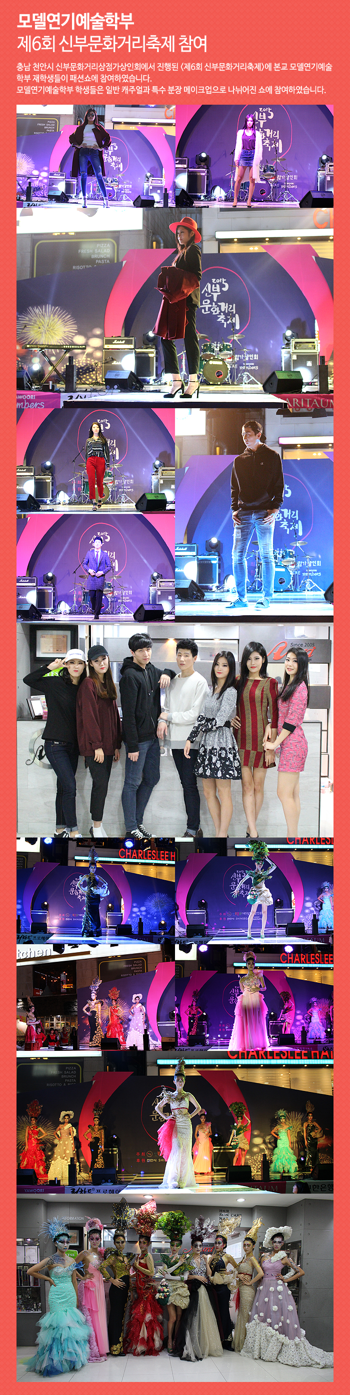 충남 천안시 신부문화거리상점가상인회에서 진행된 <제6회 신부문화거리축제>에 본교 모델연기예술학부 재학생들이 패션쇼에 참여하였습니다.