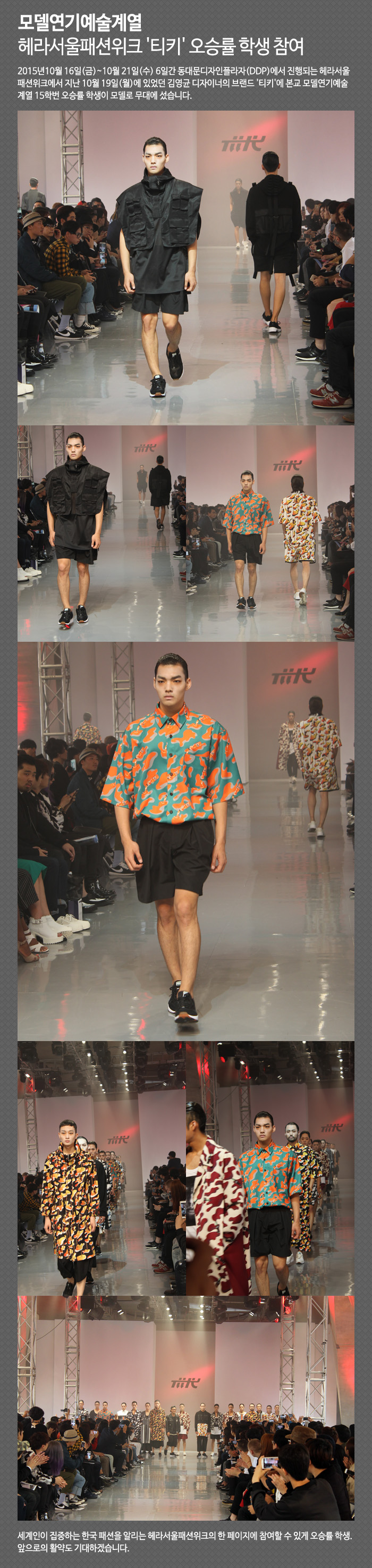 2015년10월 16일(금)~10월 21일(수) 6일간 동대문디자인플라자(DDP)에서 진행되는 헤라서울패션위크에서 지난 10월 19일(월)에 있었던 김영균 디자이너의 브랜드 '티키'에 본교 모델연기예술계열 15학번 오승률 학생이 모델로 무대에 섰습니다.