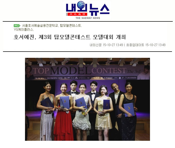 [내외신문=심종대 기자]서울호서예술실용전문학교(이하 서울호서예전)가 주관하고, YG케이플러스와 백지애웨딩이 주최하고, 카파, 라레토턱시도, 스포맥스, 닭가슴살 꼬꼬빌, 얼텀가방, 샤뜨니크선글라스가 협찬한 제3회 탑모델콘테스트가 지난 25일 서울호서예전 6층 대공연장에서 개최됐다.