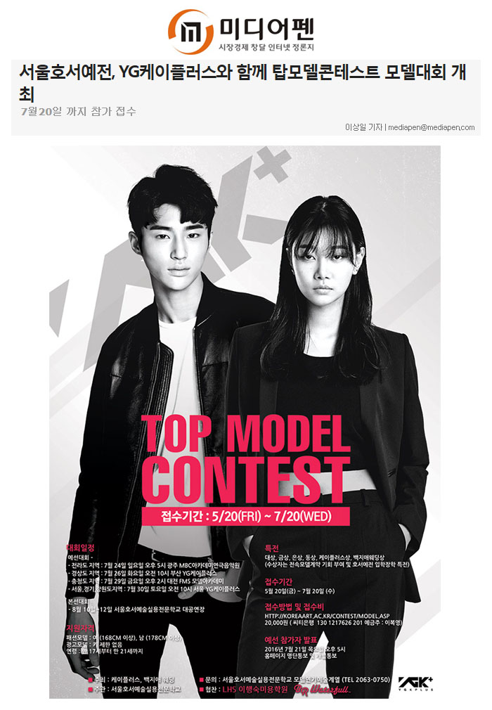 YG케이플러스와 함께하는 제4회 TOP MODEL CONTSET(탑 모델콘테스트)는 현재 7월20일(수)까지 접수 중이며서, 해당 접수는 서울호서예전 홈페이지에서 가능하다.