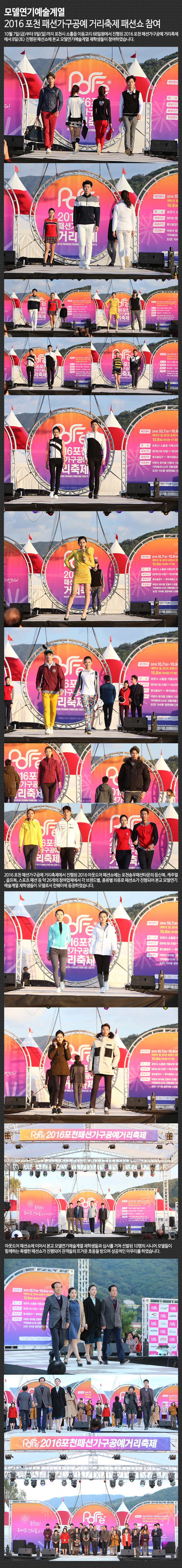 10월 7일(금)부터 9일(일)까지 포천시 소홀읍 이동교리 68일원에서 진행된 2016 포천 패션가구공예 거리축제에서 8일(토) 진행된 패션쇼에 본교 모델연기예술계열 재학생들이 참여하였습니다.