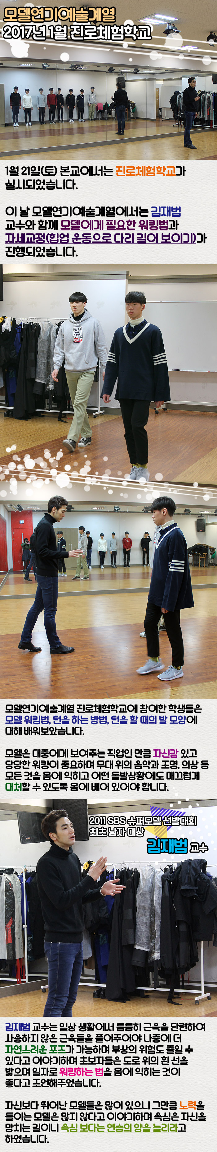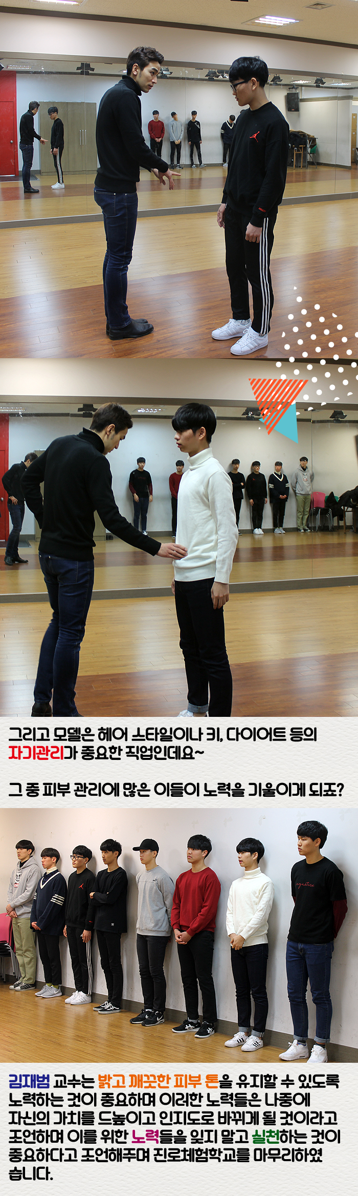 이 날 모델연기예술계열에서는 김재범 교수와 함께 모델에게 필요한 워킹법과 자세교정(힙헙 운동으로 다리 길어 보이기)가 진행되었습니다.