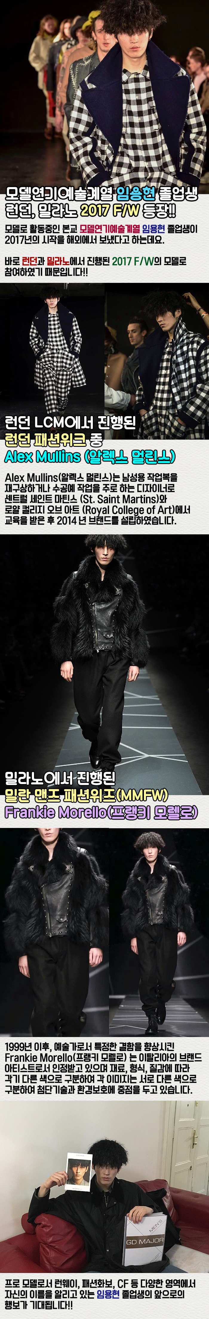 모델로 활동중인 임용현 졸업생이 2017년의 시작을 해외에서 보냈다고 하는데요. 바로 런던과 밀라노에서 진행된 2017 F/W의 모델로 참여하였기 때문입니다!!
