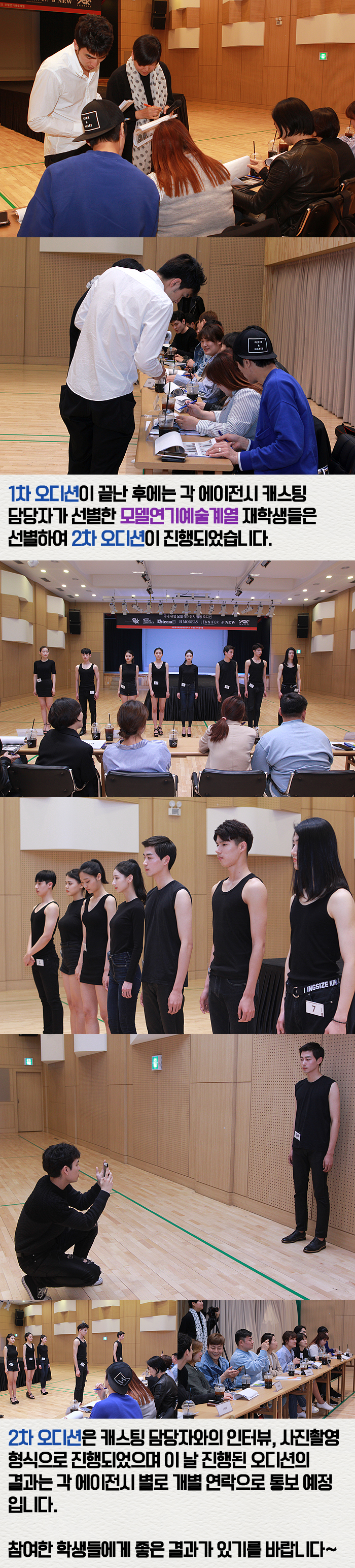 4월 25일(화) 본교에서는 국내 유명 모델 에이전시 캐스팅 담당자들이 자리한 가운데 모델연기예술계열 재학생들을 대상으로 한 오디션이 진행되었습니다.