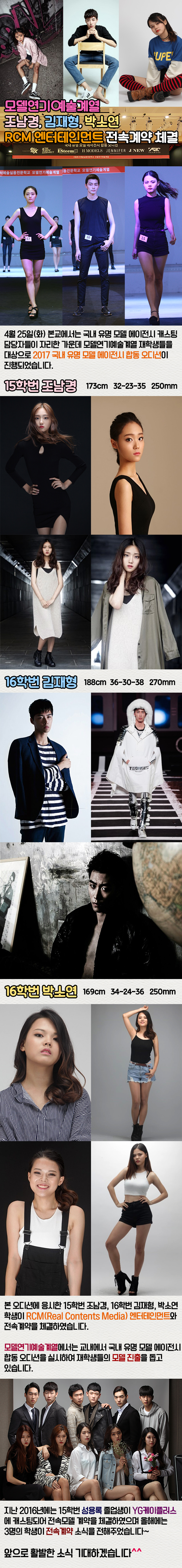 4월 25일(화) 본교에서는 국내 유명 모델 에이전시 캐스팅 담당자들이 자리한 가운데 모델연기예술계열 재학생들을 대상으로 2017 국내 유명 모델 에이전시 합동 오디션에 응시한 학생 중 3명의 학생이 전속계약 체결소식을 전해주었습니다.