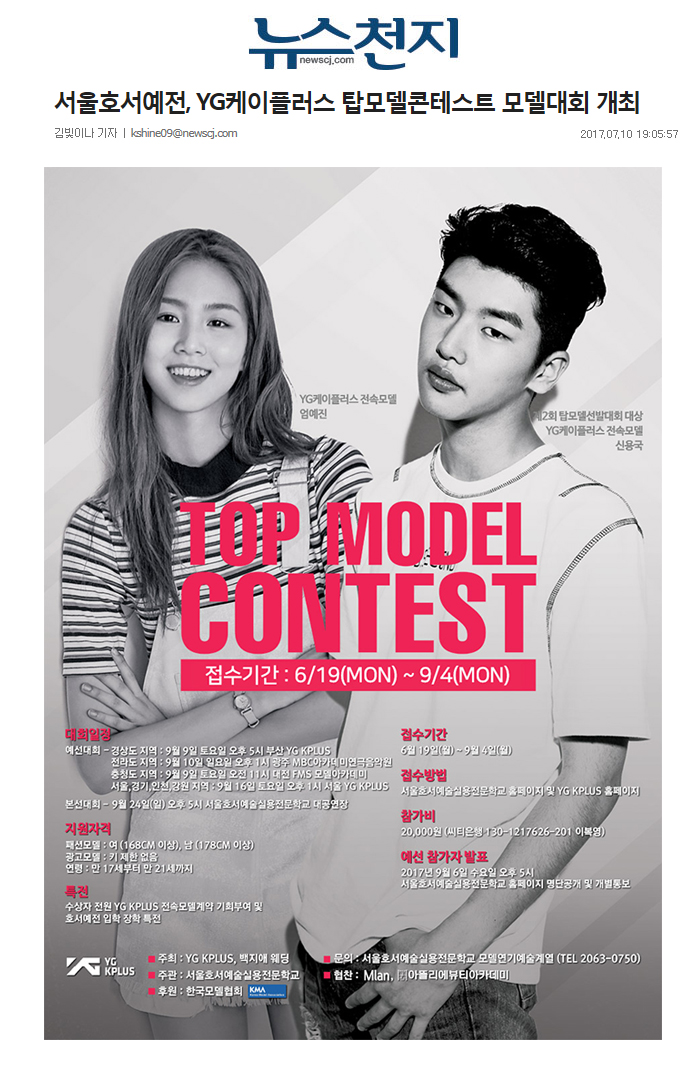[천지일보=김빛이나 기자] 서울호서예술실용전문학교(서울호서예전)가 주관하고, YG케이플러스와 백지애웨딩이 주최하는 제5회 탑모델콘테스트 모델대회가 오는 9월 24일 개최된다.